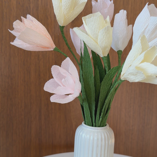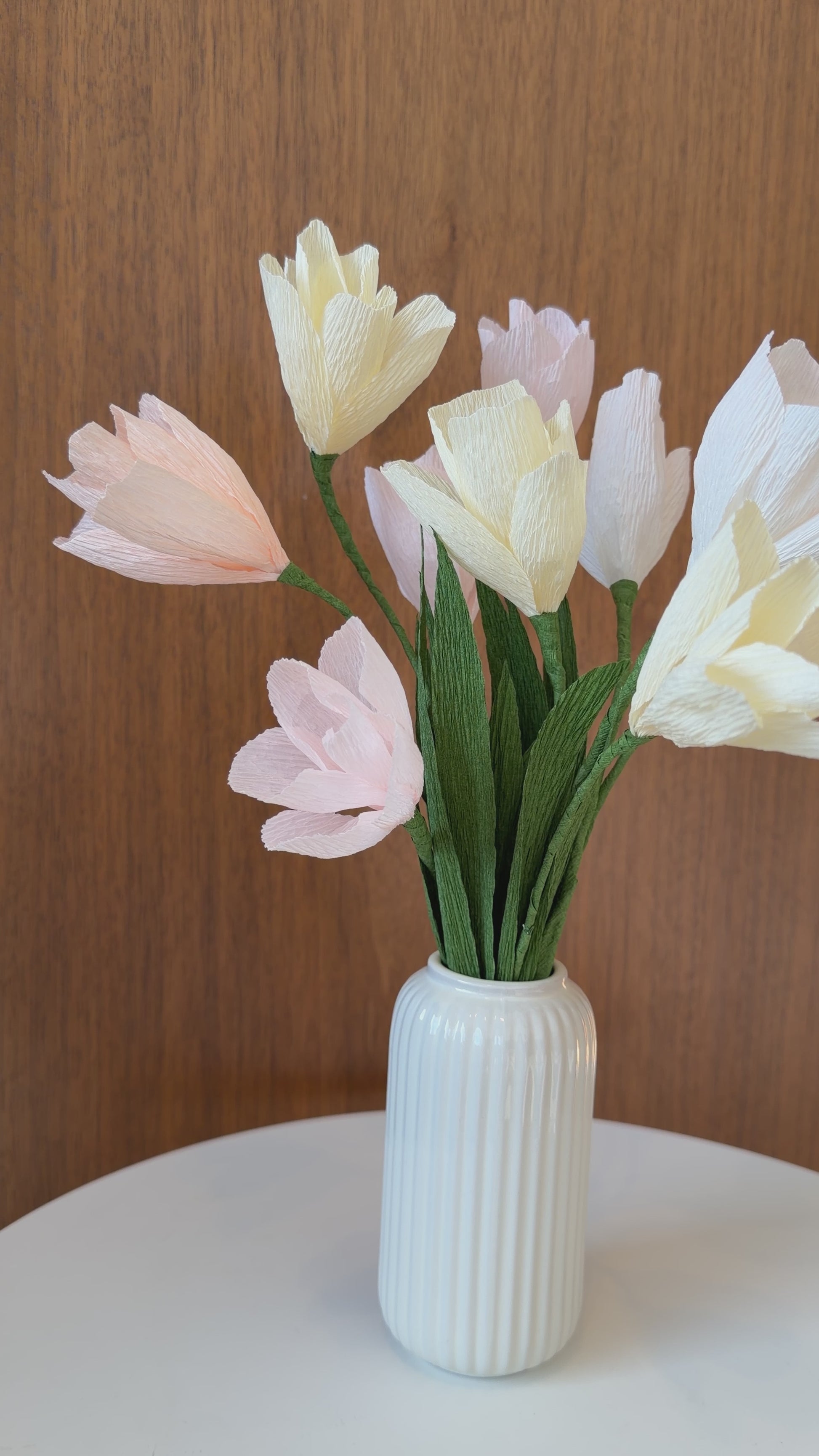 A soft, romantic arrangement of handcrafted crepe paper tulips designed to bring color, texture, and warmth into your space. No watering required, no wilting over time, just lasting beauty you can enjoy every day.
